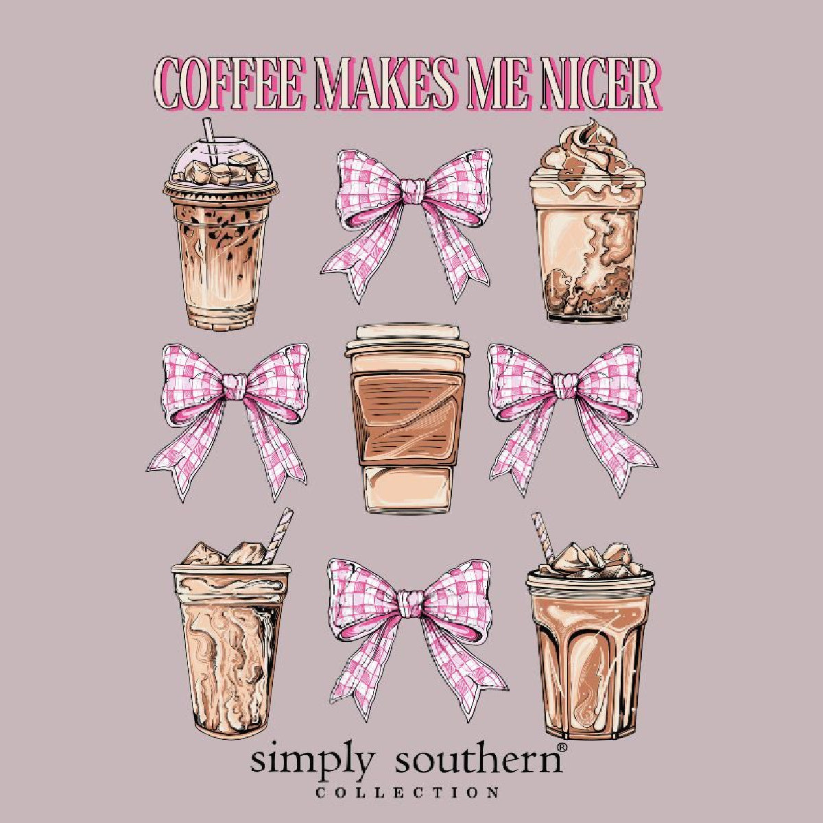 We love the playful coffee-themed graphic featuring lattes, iced coffees, and frappuccinos all dressed up with sweet bows. It's Simply Southern's signature preppy style with a fun twist. And let's be honest - we all know coffee makes us nicer!